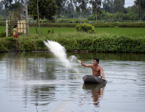 水產養殖具有更大的潛力,特別在亞洲和非洲。圖為一位越南養殖漁民在喂魚。